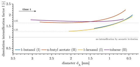 - The convective plume of the chemical systems n-butyl acetate–water and toluene–water was deflected and held back by the nodal planes above and below the drop. The standing waves had the capacity to induce additional mass transfer in the opposite direction of natural convection. This resulted in an increased intensification factor of 2 mm) as a minimum. With decreasing diameter, the intensification factor increased.