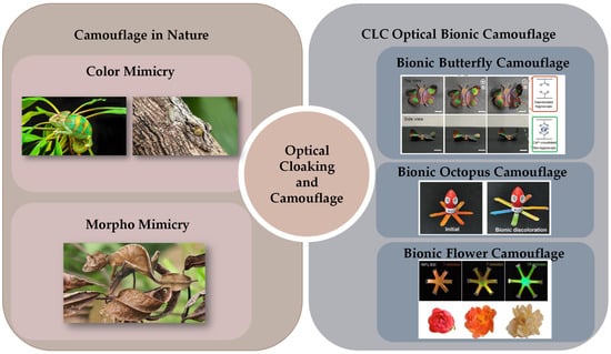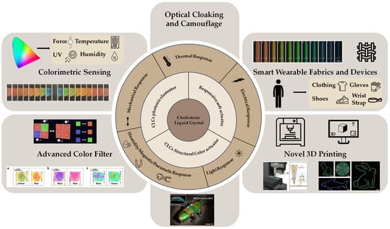 Camouflage plays a vital role in the survival and thriving of organisms in nature. Organisms frequently benefit from survival advantages by blending into their natural surroundings or mimicking dangerous species, leading natural enemies to make erroneous judgments [1,2,3]. Biological camouflage specifically refers to the capacity of organisms to alter their color and texture, allowing them to adapt their camouflage in various environments, thus enhancing their survival flexibility. Camouflage in nature can be categorized as morpho-mimetic and color-mimetic. Morphological mimicry entails imitating the shapes and textures of surrounding objects to blend the biological appearance with the environment. Color mimicry represents another significant form of camouflage, wherein organisms achieve a visual effect of blending with the surrounding background by adopting colors and patterns similar to those of their environment. These camouflage strategies are widespread, not only observed among reptiles and arthropods but also extensively developed in fish and cephalopods. Swiss researchers were the first to discover the mechanism of color change that produces structural color in chameleons [4]. The skin of chameleons comprises two layers of densely overlapping cells: the upper layer contains tightly packed guanine nanocrystals, while the lower layer consists of larger, disorganized guanine nanocrystals. By altering the arrangement structure of these nanocrystals, chameleons can change their color. Upon light passage, these cells selectively reflect short wavelengths of blue light. When chameleons are tense, they actively adjust the sparseness of the crystals, causing their arrangement to become looser and reflecting light of longer wavelengths. As the gaps increase, the color changes from blue to green, yellow, orange, and red. These structured light color changes, generated using nanostructures on the surface of living organisms, represent dynamic adaptive camouflage. Likewise, Phelsuma lizards [5], squid [6], neon fish [7], and the chameleon shawfish Hoplolatilus chlupatyi [8] can achieve camouflage using similar nanostructures. Inspired by these organisms [9], liquid-crystal-based structural color soft actuators combine the deformation characteristics of soft materials and artificial muscles with real-time dynamic broadband color changes in the visible light range. They meet the requirements of both morphology mimicry and color mimicry, pushing the color boundaries of flat visuals and offering significant application prospects in the field of camouflage. In this review, we present the current state of research on cholesteric liquid crystal photonic actuators (CLCPAs) and their technological applications. As shown in Figure 1, an overview of the classification, stimulus response, and potential applications of CLCPAs is presented. First, we outline the basic concepts of cholesteric liquid crystals and their nanostructural modulation. And we present the latest progress in cholesteric liquid crystal photonic actuators responsive to various stimuli, including mechanical, thermal, electrical, light, humidity, magnetic, and pneumatic influences. Additionally, this review discusses the practical applications of cholesteric liquid crystal photonic actuators, summarizes the prospects for developing these advanced structures, highlights the associated challenges, and explores their promising applications.
