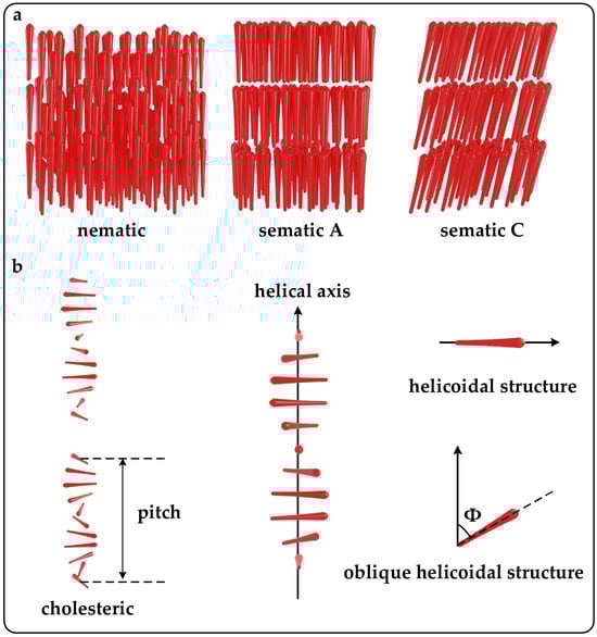 Illustration of LC molecules, alignment, and chiral pitch. (a) LC molecular arrangement of nematic, sematic A, and sematic C. (b) The arrangement of CLC molecules (where one molecule represents the molecular arrangement direction of the entire layer) and the pitch of CLCs are shown here as two cycles. To visually display the number of cycles, a virtual interval space is added. And two types of CLC nanostructures: helicoidal structure and oblique helicoidal structure.