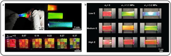 Mechanical response is the most direct and straightforward method for actuating cholesteric liquid crystal actuators, particularly in complex multilayer structures such as sandwich or Janus structures [55]. Mechanical force stimulation typically results in large displacements and significant deformations and facilitates system integration, allowing CLCPAs to achieve continuous, tunable, and wide-range reflection peaks in the visible spectrum. Freestanding mechanical response CLCPAs can be obtained by perfusing CLC precursors into glass tunnel templates after UV polymerization [56]. With increasing stretching strain, a blue shift in the photonic wavelength was observed, from 695 nm to 494 nm, indicating a shift towards shorter wavelengths (Figure 3a). To simplify the modulation of reflective structural color in response to mechanical force stimuli, variable pixel units can be obtained on the same elastic substrate by designing various Young’s moduli in advance. A series of elastic modulus values were achieved by adjusting the crosslinkers and thiol chain extenders to alter the concentration of excess acrylate, thereby modifying the crosslink density (Figure 3b) [57]. CLCPAs with heterogeneous elastic moduli were simultaneously positioned on the same stretchable substrate and stretched, resulting in simultaneous color separation from a single color to multiple colors. The multicolor separation capability of the stretchable CLCEs was investigated under one- and two-dimensional stretching, and further development of CLCPAs was pursued for device applications (Figure 3c). Pixelated CLCs on a stretchable commercial substrate exhibit varying structural colors attributed to their designed elastic moduli. Additionally, this structure can be combined with other stimuli actuators to achieve pixelated structural color responses to thermal, electrical, optical, and other stimuli.
