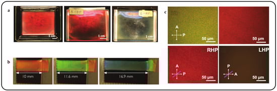 CLCE obtained by a method based on anisotropic deswelling. (a) CLCE with initial color red and its image through the left/right-hand polarizer [60]. (b) Structural color changes of CLCE under different stretching lengths [60]. (c) Polarizing optical microscopy (POM) images in transmission or reflection (with or without left/right-hand polarizer) [60].