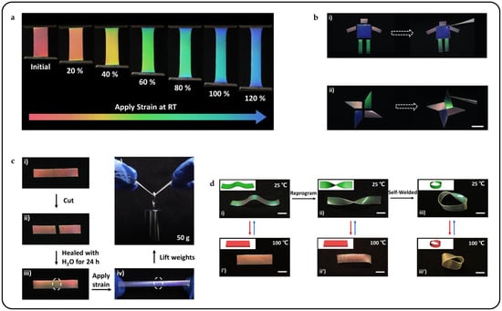 Shape-programmable, and self-healable CLCPA. (a) Stretching by mechanical force at room temperature [71]. (b) Self-healing demonstration of cartoon (i) and windmill (ii) patterns [71]. (c) Self-healing process of CLCPA with red initial color (i–iii) and its mechanical properties (iv,v) [71]. (d) Demonstration of motion through photonic actuator deformation driven by temperature difference [71]. Each actuator can reversibly change the 3D shape (i–iii, i’–iii’) and color (i–i’, ii–ii’, iii–iii’) at temperatures of 25 °C and 100 °C.