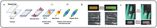 Pixelated mechanical force-responsive CLCEs with real-time color change show great potential for development in next-generation displays. The preparation method for obtaining a flexible actuator with a uniform initial color over a large area is of practical importance. The “anisotropic deswelling” method, proposed by the Finkelmann group, was the first to achieve large areas of uniformly colored CLCEs [58]. This solution involved continuous centrifugation at elevated temperatures for 10 h. During the first half, the hydrosilation reaction occurred, followed by solvent evaporation in the second half. Although this method produced a visually significant improvement, and subsequent work reduced the centrifugation time to 5 to 8 h [59], the method was very cumbersome and needs further improvement. Rijeesh Kizhakidathazhath et al. presented a concise and refined method for fabricating large-area CLCEs with uniform coloration (Figure 4a) [60]. The method relied on a two-stage thiol-acrylate Michael addition and photopolymerization reaction to produce non-chiral nematic main-chain elastomers, transitioning to CLCEs through the introduction of the diacrylate chiral mesogen LC756. Additionally, this refinement allowed the process to proceed without centrifugation and at near-room temperature, while anisotropic deswelling was utilized to control helix orientation. The procedure entailed casting the CLC precursor solution onto a substrate, where it reacted to form a CLCE film exhibiting selective reflection color in the visible spectrum. When the film was stretched uniaxially or biaxially orthogonal to the helical axis, a notable blue shift occurred, promptly returning to the original state upon strain removal, even after prolonged strain application (Figure 4b). CLCs exhibited a distinction between left- and right-handed nano-helical axes, discernible by incorporating left- and right-handed polarizers into the optical path in the reflected state (Figure 4c). The nanostructure will reflect light that is identical to its chirality and transmit light that is opposite to its chirality. Leveraging this property, it becomes possible to manufacture one or more layers of optical filters with tunable selective reflection characteristics in terms of bandwidth and central wavelength.