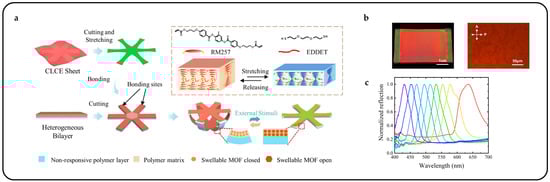 Multilayer structures play a crucial role in biomimetics, especially in emulating the complex structures found in biological organisms. This characteristic mirrors the regulatory abilities of biological organisms and their responsiveness to their environment, serving as a model for designing adaptive optical materials [83]. Using metal–organic framework (MOF)-based composite films as rigid actuation substrates enabled the support and mechanical guidance of spatial configurations for flexible CLCE sheets [84]. The components mainly consisted of two layers: the CLC sheet and the MOF-based actuation substrate (Figure 7a). Direct structural color programming of the CLCE sheet was facilitated by adjusting the thickness distribution, thus eliminating the need for cumbersome chemical modifications. Figure 7b depicts a red CLCPA photo along with a POM image. The deformation of the released flowers caused a shift in the CLCPA selective reflectance spectra, as depicted in Figure 7c.
