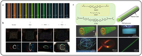 Recently, mechanochromic CLCE fibers were successfully fabricated using an innovative method [11]. An extruded oligomeric CLCE precursor solution was deposited onto a rotating mandrel and subsequently subjected to photo-crosslinking after annealing to form CLCE fibers (Figure 8a,b). However, this approach had inherent limitations: the fiber cross-section generated by the production method is strip-shaped rather than cylindrical. The subtle balance of the process occurring before crosslinking makes it sensitive to any deviation from the optimal processing parameters. Consequently, expanding core-based processes to meet industrial output expectations is challenging. To address these constraints, a novel strategy was devised wherein the CLCE fiber synthesis took place within the core of a low-density polyethylene tube, which could be readily dissolved after post-process completion [29]. This method not only facilitated the templating of cylindrical shapes and mitigated breakage due to capillary forces but also ensured confinement within the tube, thus promoting tangential alignment along the tube wall. This confinement promoted tangential alignment along the tube wall, enforcing the desired radial alignment as the cholesteric structure of the precursor liquid crystal developed within the fiber (Figure 8c).