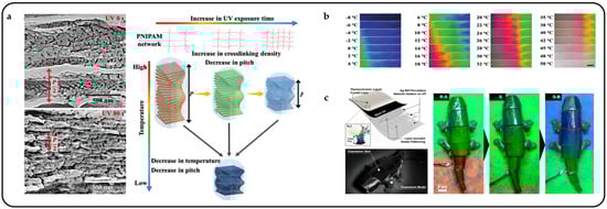 Cellulose is now an emerging chiral liquid crystal spiking material that self-assembles nematic liquid crystals into cholesteric liquid crystals [92]. Cellulose nanocrystals play the role of a rigid backbone and have the same optical property of birefringence as liquid crystals. By incorporating cellulose nanocrystals into liquid crystal systems, CLCs with bright structural colors can be obtained after complete evaporation of the solvent [93]. It has been shown that cellulose nanocrystals exhibit left-handedness, selectively reflecting left-handed CPL and transmitting right-handed CPL [94], and that the resulting color can be altered by the addition of glucose [95] or sodium chloride [96] or by applying an electric [97] or magnetic field [98] to a suspension of cellulose nanocrystals to induce a change in pitch value. Xiaoxiang Wen et al. presented a methodological advancement in the fabrication of a thermochromic and circularly polarized cholesteric phase cellulose composite (CPCC) [99]. Drawing inspiration from the color-shifting and polarizing attributes observed in beetles, the CPCC is synthesized by combining hydroxypropyl cellulose with a cholesteric liquid crystal structure and a crosslinked PNIPAM network. Importantly, the density of crosslinking affects the thermochromic response, which can be finely adjusted by modulating the UV exposure duration during PNIPAM synthesis. As the temperature rises, the CPCC exhibits a red shift in color, indicating an expansion in the pitch of the CLC structure. As anticipated, when the temperature increases, the pitch increases, which causes a red shift in the reflected colors, as depicted in Figure 9a. With the increase in temperature, the color of CPCC experiences a redshift, indicating an expansion in the pitch of the CLC structure in response to the rising temperature (Figure 9b).