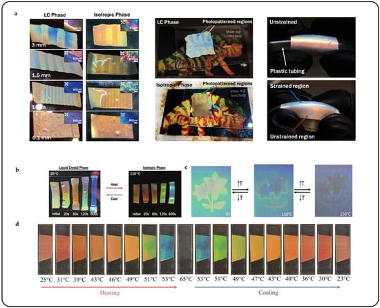 A demonstration highlighted the control over the color and shape reconfiguration of an AFT-capable CLCPA, showcasing spatiotemporal control over the material’s programmability and resulting in intricate patterns within the CLCPA [43]. Using a photomask with striped patterns of varying line spacings, the CLCPA was selectively patterned to create lines seemingly shifted towards blue. Upon heating, the patterned regions experienced a red shift; however, due to incomplete reversal, the lines appeared yellow/green in contrast to the red unpatterned regions (Figure 10a). Likewise, a chameleon skin display was created by patterning the CLCE with a uniquely shaped photomask to mimic the pattern of a chameleon’s skin. In the “relaxed” state, the pattern appeared blue and yellow, resembling the coloration of a chameleon’s skin. However, upon heating the material to its isotropic phase, it displayed green and red hues, akin to the coloration of a chameleon’s “excited” state (Figure 10b). Apart from being responsive to solvents, the reduced crosslink density imparted adequate flexibility to the coating, enabling it to undergo reversible color changes upon reaching the temperature for the cholesteric to isotropic phase transition [102]. This phenomenon was evidenced by the disappearance and subsequent reappearance of color upon exposure to elevated temperatures (Figure 10c).