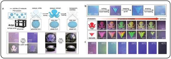 A 3D-printed biomimetic octopus exhibits synergetic responses in both color and shape. (a) Utilizing 3D printing technology, a CLC-droplet-dispersed polyvinyl alcohol (PVA) solution is printed into the shape of an octopus. Upon heating, the opaque and colored octopus becomes transparent and colorless [42]. (b) The process involves writing and erasing on oblate CLC-droplet-dispersed PVA films, enabling the creation of logos and anti-counterfeit barcodes [42]. (c) As the temperature increases, the structural color of CLC-dispersed droplets shifts to blue [42].