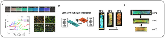 Bending and color changes responsive to near-infrared light can be achieved through the utilization of a bilayer hydrogel comprising an inverse opal scaffold or a cellulose nanocrystal/polyurethane bilayer [111]. Pei Zhang et al. have successfully developed a pigmented structural color actuator utilizing CLCEs, demonstrating a lower actuation temperature and tunable responses to both temperature and near-infrared light for both actuation and coloration [110]. At 22 °C, the resulting CLCE film appeared green (Figure 12c), due to the combined effect of reflection by the cholesteric structure and light absorption by the embedded dye. To differentiate between the temperature-responsive reflection and absorption contributions, they fabricated a CLCEs film devoid of the near-infrared dye and a liquid crystal elastomer film lacking cholesteric order. At 22 °C, the resulting film exhibited a greenish-blue color due to reflection, appearing brighter compared to pigmented CLCEs. Upon heating to higher temperatures, the color shifts to red, a reversible process upon cooling (Figure 12b).
