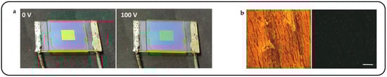Electrically controlled liquid crystals serve as a transformative force in modern technology, reshaping various fields with their dynamic capabilities, particularly in displays and optical devices. In conventional liquid crystal displays (LCDs), electric fields are utilized to alter the orientation of liquid crystal molecules, thereby modulating the passage of light and generating high-resolution, high-contrast images [116]. Liquid crystal display devices utilizing electric field modulation have mature supporting systems, whereas CLC real-time structured color display devices do not rely on artificial light sources and can be employed in soft, low-power displays. Under the influence of an electric field, CLCs can not only undergo structural color changes but also adjust their transparency. In the fingerprint texture, the helical axis of the liquid crystals aligns parallel to the substrate, preventing selective reflection of incident light wavelengths and rendering the device transparent. In the homeotropic texture, liquid crystal molecules align in a directional order perpendicular to the substrate, facilitating transitions to other textures and rendering the CLC device transparent. Conversely, in the focal conic texture, the random distribution of CLC helical axes scatters incident light, resulting in non-transparency of the device. Bistable or multistable liquid crystal devices can be formed by utilizing electrically driven CLCs to transition between the aforementioned textures [50,117]. Their energy consumption is low, and they can be controlled within milliseconds. Alexey Bobrovsky et al. investigated the effects of electric fields and ultraviolet light on photochromic liquid crystal mixtures, analyzing their impact on the structure and performance of composite materials [13]. When subjected to an electric field, liquid crystal molecules aligned along the field direction, causing deformation of the helical structure [22,118]. Conversely, ultraviolet light induced the isomerization of azobenzene-containing molecules in a photochromic mixture (Figure 13a). These changes were reversible, with the initial state being restored upon deactivation of the electric field or exposure to visible light. The study also observed that the degree of polymer network swelling in a photochromic liquid crystal mixture is relatively low. Polarizing optical microscopy revealed the coexistence of planar oily streaks and marbled nematic textures, as shown in Figure 13b. After electric field-induced network swelling, the selective reflection band of the composite becomes switchable with high-frequency electric field application. Additionally, the electric field induced a shift of the center of the selective reflection peak to the shorter wavelength range, resulting in a change in color from red to green. This shift significantly affects only the long-wavelength shoulder of the selective reflection band, reducing the bandwidth approximately three-fold.