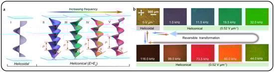 Schematic diagram of frequency-driven spiral soft structure at relatively low electric field intensity. (a) Schematic diagram of the influence model of frequency on nanostructures. (I) In the absence of an external electric field, LC molecules are perpendicular to the helical axis. (II) Increase the electric field signal with initial frequency and intensity, and the LC molecule revolves around the helical axis with an inclination angle of θ. The helix pitch length P and slope angle θ (II–V) increase with increasing frequency, resulting in tunable spectral range of wide reflection spectra. (b) At a fixed electric field intensity, as the frequency increases from 1.0 kHz to 116.0 kHz, the textures of helical and electro-induced helical microstructures exhibit different reflection colors [127].