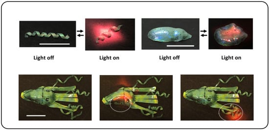 - Pan, X.; Grossiord, N.; Sol, J.A.H.P.; Debije, M.G.; Schenning, A.P.H.J. 3D Anisotropic Polyethylene as Light-Responsive Grippers and Surfing Divers. Adv. Funct. Mater. 2021, 31, 2100465. [Google Scholar] [CrossRef]