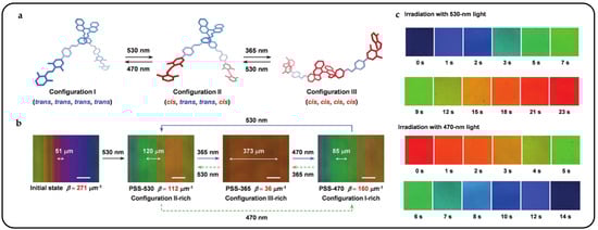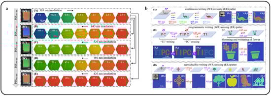 - Liu, J.C.; Han, Z.T.; Wu, P.P.; Shang, Y.Y.; Chen, J.S.; Jia, P. Photochromic Azobenzene Inverse Opal Film toward Dynamic Anti-Fake Pattern. Molecules 2023, 28, 5881. [Google Scholar] [CrossRef] [PubMed]