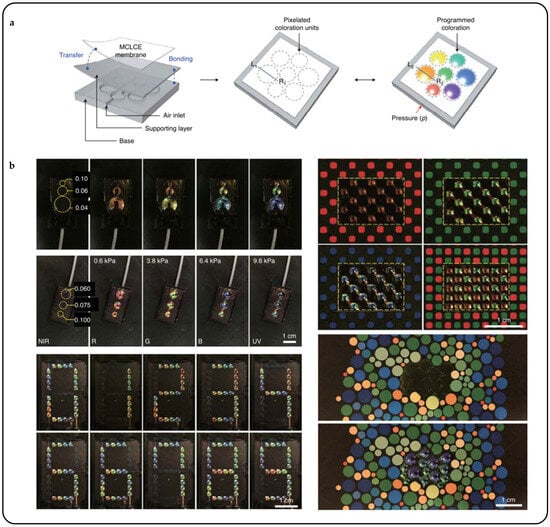 An alternative method for electrically controlling the structural color change involves utilizing motors or signals to drive elastomers or actuators, inducing overall or regional deformation of a CLCPA. By precisely controlling the magnitude and direction of electric fields, researchers can fine-tune the helical structure of CLCs, thereby altering the wavelength of reflected light and producing vivid color changes [128]. Investigations were conducted on the optical characteristics of stretchable cholesteric liquid crystal elastomers (CLCEs) under out-of-plane stretching using a circular pop-up pillar, as illustrated in Figure 16c. The potential applications of stretchable CLCEs in conveying meaningful information were explored. This demonstrated successful control over the display of informative letters “LC” through the manipulation of equivalent out-of-plane stretching modes, as depicted in Figure 16d. This achievement was made possible by inducing a color change in the CLCEs from red to green during the out-of-plane stretching process.
