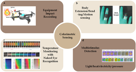 Low-molecular-weight CLCs can be encapsulated within a polymer matrix, leading to the formation of polymer-dispersed CLC systems [49]. These systems display reflective color shifts in response to temperature changes, which are attributed to the thermotropic nature of CLCs leading to variations in pitch length. Thermal response CLC droplets can be heated using a heater. The heater comprises a thin electrically conductive layer that efficiently generates rapid, controlled Joule heating by applying an electric current or potential to the surface area [108]. Arne A. F. Froyen et al. introduced multifunctional structural-colored electronic skins developed using scalable solution-processed methods, providing simultaneous monitoring of skin temperature and body motion through optical and electrical responses, respectively [109]. These multimodal photonic wearables integrated a temperature-responsive, freestanding photonic film with a thin, flexible conductive layer. The electrical output was established using silver nanowire (AgNW)-based ink, while photonic emulsions were employed to fabricate the freestanding structural-colored film (Figure 12a). Gradual heating of the photonic wearable induced a blue shift across the entire visible spectrum within a narrow temperature range, surpassing the smectic–cholesteric phase transition point of the thermosensitive CLC mixture. Notably, distinct colors were discernible for every 1 °C change in temperature, enabling these photonic wearables to detect subtle variations in body temperature through optical feedback.