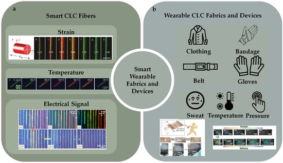 A CLC fibroid is a type of raw material for smart textiles with intelligent responsive characteristics, enabling color changes or transparency adjustments based on external conditions [85]. Embedding CLCPAs into textiles enables smart temperature regulation to be achieved [86]. As the environmental temperature rises, alterations in the arrangement of liquid crystal molecules result in shifts in the fabric’s color or adjustments in transparency. CLC fibroids can also find applications in the field of intelligent health monitoring. By monitoring the wearer’s physiological parameters, such as biomolecule analysis [87], humidity [88], sweat [89], and pressure [90], smart textiles can dynamically adjust color or transparency, providing timely health alerts and monitoring functions. Additionally, liquid crystal smart textiles offer environmental benefits and energy savings by reducing energy consumption and waste generation, aligning with the concept of sustainable development.