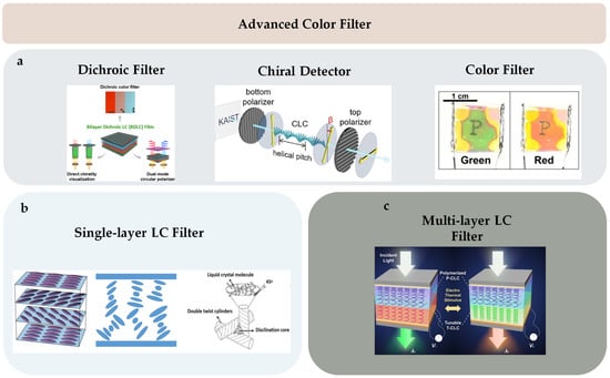 - Park, G.; Choi, Y.S.; Yun, H.S.; Yoon, D.K. Fabrication of Bilayer Dichroic Films Using Liquid Crystal Materials for Multiplex Applications. ACS Appl. Mater. Interfaces 2020, 12, 45315–45321. [Google Scholar] [CrossRef] [PubMed]