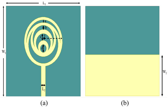 With the rapid advancement in the field of present-day communication applications, there is a significant requirement for broadband and miniaturized devices [20,21,22]. Slotted antennas have good potential due to their considerable benefits, like low profile, low cost, and wider bandwidth. In addition, modern wireless communication devices with circular polarization give better flexibility without causing outrageous polarization discrepancy [23,24,25,26]. Subsequently, there are numerous endeavours to develop wideband antennas. For slotted antennas [27], a different technique is realized by loading an L-moulded inverted stub connected to the feed line and embedding a couple in the slotted section. An impedance bandwidth of 30.36% was accomplished [27]. In [28,29], two symmetrical strips, one adhered to the ground section and the other embedded in the feed line, achieved an impedance bandwidth of 36.01%. In [30,31,32,33], microstrip patch antenna grounds are considered with a couple of cap-shaped patches, obtaining a bandwidth of 65.65%. A constant aperture consists of two diamond-structured slot sections connected to the signal feed line in [34], obtaining an impedance bandwidth of 67.60%. In [35], a falcate-designed circular slot transmitting patch was implanted to achieve a bandwidth of 58.7%. Recently, an antenna with a bandwidth of 73.33% was acknowledged in [36] using a radiator connected by a feed line. A monopole antenna [37] is introduced, with a pentagon-shaped slot ultra-wide-band application. To alter the circular patch for improved results, specialists suggest incorporating a tapper in the design [38] and implementing slots [39,40]. A portion of these shapes was utilized as rings [41]. A band notch is introduced by presenting a couple of slits and a resonator [42,43] and changing the gap between the slits [44]. At times, segments are shown in the ground plane and the grounds of the monopole antennas [45] by providing tapered feed to obtain a super wideband in patch antennas [46]. The presentation of slots into transmitting patches and defective structures on the ground of different slots was examined [47]. To further develop the antenna attributes, a DGS is also likewise taken into consideration [48]. They are utilized to acquire a wider band [49,50]. Multi-band is achieved by an enhanced circular patch and two I-shaped slots on the ground plane [51,52,53,54,55,56,57,58,59,60,61].