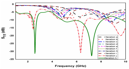 In step a (Figure 1), a basic circular patch antenna has been designed, resonating at 5 GHz with a return loss of −10 dB. A radius of 7 mm has been subtracted from the circle at step a; the antenna resonates at 4.8 GHz with a return loss of −10 dB. In step c, a circle is united with step b, and to obtain step d, a circle of radius 6mm is subtracted. A circle of radius 5 mm is united with the circle at step d to attain step e. Step f is obtained by attaching 4 mm radius circle to step e. Step g is obtained by uniting a circle having a radius of 3 mm. Step h is obtained by uniting a circle to step g. Step i is attained by attaching a circle with a 1mm radius to step h’s antenna design. Lastly, at step j, a 0.5 mm circle is subtracted from step i and this iteration is considered as the final one, in which we have obtained the desired results at our desired resonating frequencies.