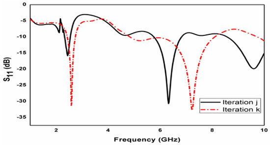 The obtained results of the device are tabulated in Table 2. Antenna parameter geometry against frequency with d variations is clarified in Figure 5. Here, another case study is carried out for iteration j and iteration k. In this case, minimal deviation is observed for these scenarios of an iterative process. Compared to the two bandwidth values, the second band achieves good bandwidth. The interesting feature of this work is the wider bandwidth. When the antenna operates at 3.1 GHz, it achieves 500 MHz bandwidth. Similarly, when the antenna operates at a 9.3 GHz frequency, the antenna obtains a 4800 MHz wider bandwidth. The crescent slots are realized to obtain wider impedance and good gain. The circular rings achieve good impedance, and the obtained bandwidth is utilized for many applications.