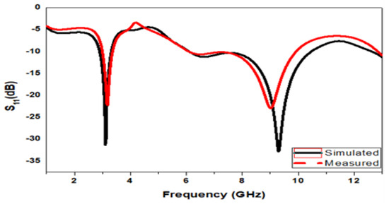 The fabricated antenna of the crescent patch antenna is displayed in Figure 6. Here, in this work, half ground is considered to enhance the characteristics of the antenna. However, a minimum deviation is observed between the measurements with the simulated values. The experiments with the simulated results are evaluated in Figure 7. It is noticeable that the variation is minimal in this case. The proposed device achieves minimum return loss. The simulated model, the fabricated one in the front view, and the fabricated model in the back view with the half ground are all depicted in the figure. The crescent antenna achieves miniaturization and can be used in different applications. The crescent antenna photographs are clarified in Figure 6.