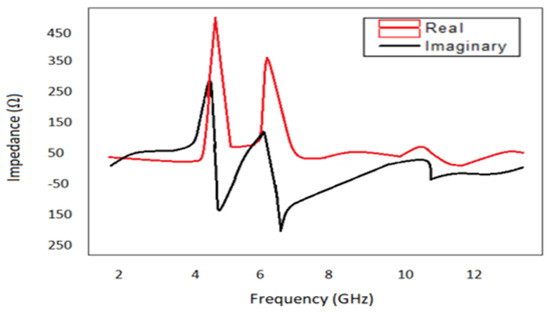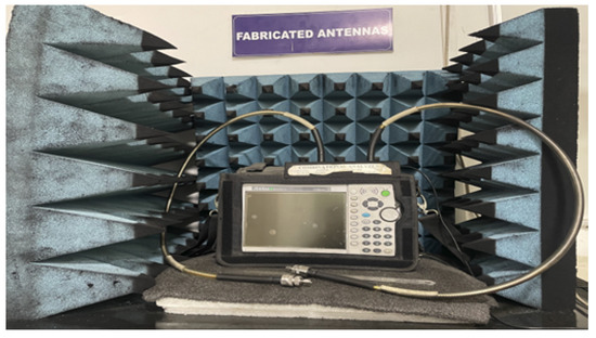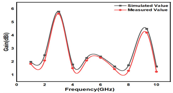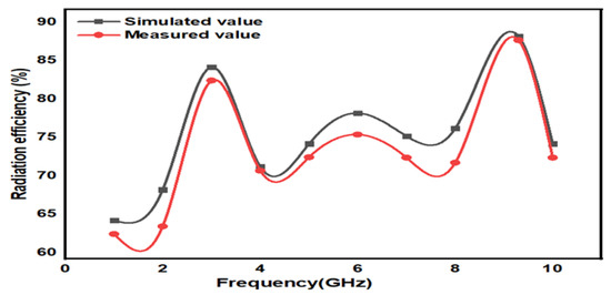 In Figure 8, the proposed design states that the E-field and H-field distributions are semi-omnidirectional and omnidirectional. The input impedance matching is also observed for the device. The proposed device achieves a 50-ohm impedance. The impedance for the presented annular ring crescent antenna is shown in Figure 9. The antenna current’s fields at 3.1 GHz and 9.3 GHz are given in Figure 10. The surface currents and electric fields are also shown in Figure 10. As shown in Figure 11, the suggested antenna has gain values of 5.8 and 4.5 over the operating frequency, which are within an acceptable range. The basic fabricated antenna with an anechoic chamber is clarified in Figure 12. As shown in Figure 13, the proposed antenna declares a radiation efficiency value of >80% across the operating frequency.