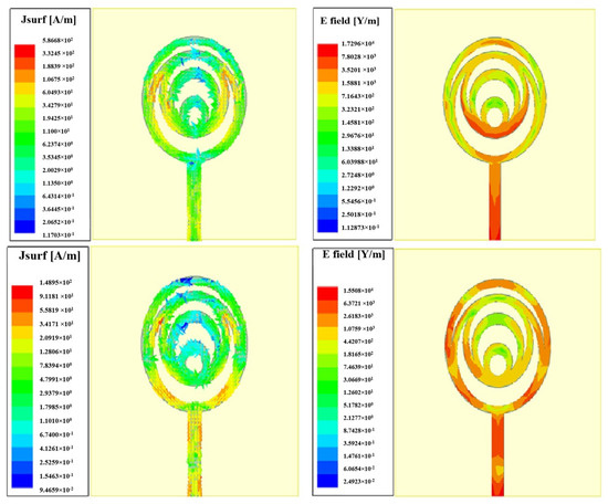 The device’s simulation current fields are also provided at two operating bands. The minimum discrepancies are observed in the experimental results. Due to manufacturing errors, there is minimal deviation. However, the simulation does not allow mismatch losses. The antenna’s bandwidth is given in Table 3. The comparison of the proposed work with the existing literature survey is listed in Table 4.