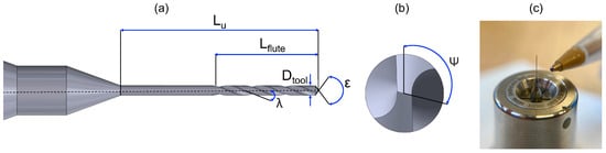 Microtwist drill geometry. (a) Longitudinal view. : tool diameter; : flute length; : tool usable length; ϵ: point angle; λ: helix angle. (b) Front view. ψ: chisel edge angle. (c) 0.138 mm microdrill.