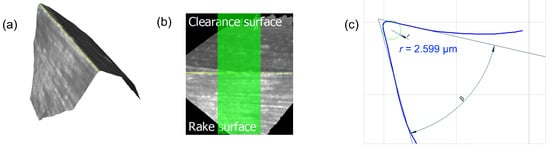 Cutting edge radius measurement by means of Alicona InfiniteFocus G6. (a) Acquisition of the cutting edge with the EdgeMasterModule. (b) Portion of the cutting edge highlighted in green containing the 800 profiles to be averaged. (c) The averaged profile of the cutting edge was evaluated within the region of interest.