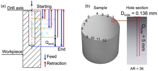 (a) Deep-drilling strategy with retraction of the tool. represents the peck depth. (b) Sample with hole run order and hole section.