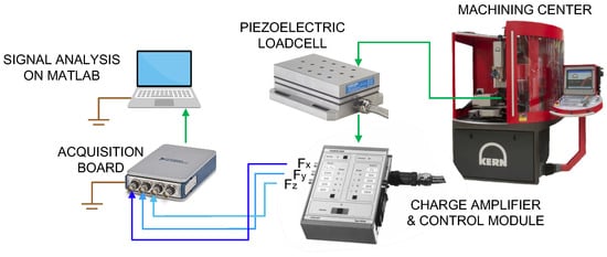In this work, a multi-component piezoelectric dynamometer, Kistler Type 9257BA (Kistler Group, Winterthur, Switzerland), was used to monitor the process, measuring the three orthogonal force components Fx, Fy and Fz with a 51,200 Hz sampling frequency. Being based on the piezoelectric operating principle, this dynamometer is suitable for measuring even low variations and values of forces, as expected during micromachining. The dynamometer comprises four three-component force sensors installed under high preload between a base plate and a cover plate. These force sensors measure the force components directly, with minimal displacement. The dynamometer incorporates a built-in three-channel charge amplifier, resulting in a low-impedance output signal. The load cell, equipped with a test specimen, was installed inside the Kern EVO machining center. The signals from the Kistler Type 9257BA piezoelectric transducer are thus processed by the Type 5233A1 Kistler control unit. In this work, a full scale of 1 kN was selected for signals in x, y, and z directions. Then, the outputs in the three directions are acquired by a four-channel NI9234 USB acquisition board (National Instruments, Austin, TX, USA) and sent to a computer for analysis using Matlab (R2020a, MathWorks, Natick, MA, USA). This process and the equipment are represented in Figure 6. Every acquisition session was preceded, as suggested by the user manual, by a minimum of 60 min warm-up to ensure thermal equilibrium.
