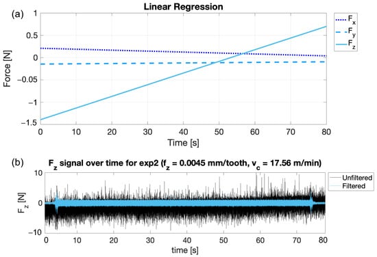 (a) Linear regression of the force signals for Run 02 (exp2) in the x, y, and z directions showing the drift effect. (b) Run 02 (exp2) filtered force signal in the z direction, compared with the raw one affected by drift.