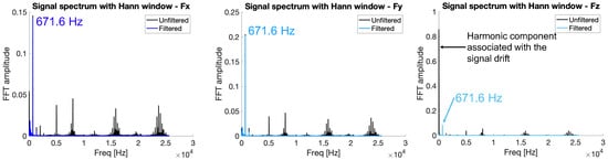 Signal spectrum for FFT of Run 02 (exp2). Each graph shows the frequency content of the force signals in the x, y, and z directions that have been processed. These show how, after the filtering operation, nonsignificant frequencies unrelated to the spindle rotation frequency were removed without altering the amplitude in a relevant way.