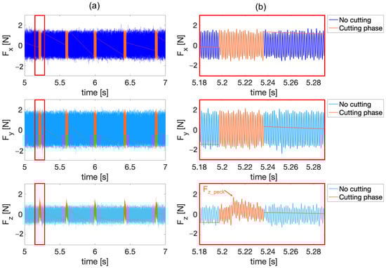 Since material removal occurs only in some intervals according to the used peck drilling strategy, it was necessary to isolate the individual pecks in the acquired signals. To do this, an algorithm was developed in Matlab. The main idea of the Matlab code dedicated to signal analysis is to extrapolate the three cutting force components using the signal of the thrust force Fz as a trigger for the occurrence of the cutting actions. Indeed, a noticeable spike occurs whenever the engagement of the cutting edges takes place (see the close up of the force signal in the z direction in Figure 9b). Therefore, a tunable and parametric algorithm capable of identifying and isolating, with minimal user input, every spike associated with the cutting action and avoid any spikes of a random nature was written.