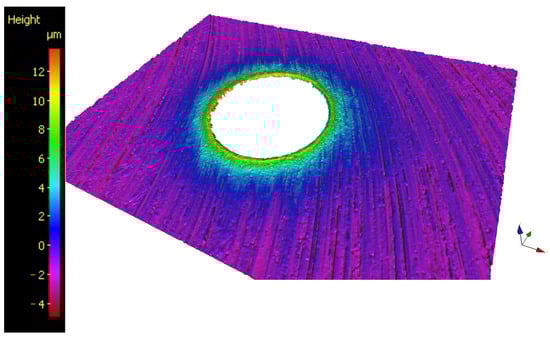 The 3D dataset used to measure burr height Hburr and hole entrance diameter Dentr, shown in Figure 11, was acquired using the AliconaG4 3D optical microscope (Bruker Alicona, Graz, Austria). Specifically, through the IP-LaboratoryMeasurementModule 5.1 software, an objective with X50 magnification and a measurement range of 250 × 220 µm was used. After the surface acquisition, the dataset coordinates reference system was adjusted by fitting a plane to correctly identify the z-axis orientation. The “best-fit function” was chosen for the fitting procedure.