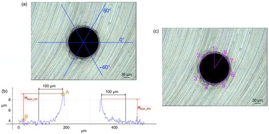 The procedure described in BS EN ISO 8785:1999 [36] was followed to measure the burr height. In this case, the ProfileFormMeasurement function of the Alicona software (MeasureSuite 5.3.9, LaboratoryMeasurementModule 5.1) was used to analyze the surface profile selected on the 3D dataset. A total of three lines were drawn through the center of the circumference of the borehole at angular positions 0°, 60°, and −60°, as shown in Figure 12a. For each profile, two burr heights were measured: one on the right (Hburr_RH) and one on the left (Hburr_LH). These were measured as the distance between the maximum peak of the burr profile (point A) and the highest point at a minimum distance of 100 µm from A (point B). This procedure is reported in Figure 12b. As a result, six burr height measurements were obtained for each hole.