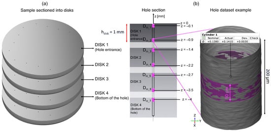 For this reason, the specimen was sectioned by wire electrical discharge machining (WEDM) transversely into 1 mm-thick disks (see Figure 13a). After some preliminary tests to assess the maximum acquisition depth achievable while ensuring satisfactory measurement quality (number of points), it was decided to acquire a depth of 200 µm from the borehole entrance on both sides of the disks. Deeper acquisitions in fact caused a gradual and rapid reduction in the density of the point cloud, which means a less accurate dataset. Therefore, the measurement of the diameters along the depth of holes was carried out using the GOM Inspect software (version 2.0.1, Carl Zeiss, Oberkochen, Germany). To maintain consistency in the diameter measurement of each dataset, a 50 µm height region of interest (purple region in Figure 13b) was selected at the center of the 200 µm acquisition to best fit the cylinder in all hole datasets. This allowed us to obtain the same number of points for all measurements, since some datasets had disturbances in some regions that did not allow the entire point cloud to be used. The measurement points from Din_1 to Din_7 were positioned at z = −0.1, −0.9, −1.4, −2.2, −2.7, −3.5, and −4.0 mm from the entrance hole. The trend of the hole diameter along its axis from the seven measurements (Figure 13) was evaluated (see Section 3.2).