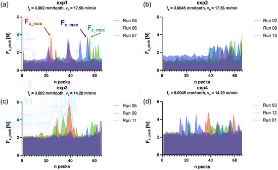 At the peck-related time window identified in Fz, the time windows of Fx and Fy were also extracted. This procedure is shown in Figure 10a (Run 02—exp2). Here, the pure cutting phases, in which material removal takes place, were isolated from the rest of the signal, in which the tool is repositioning and therefore not cutting. Here, the maximum value detected in the cutting phase (one single peck) is shown.