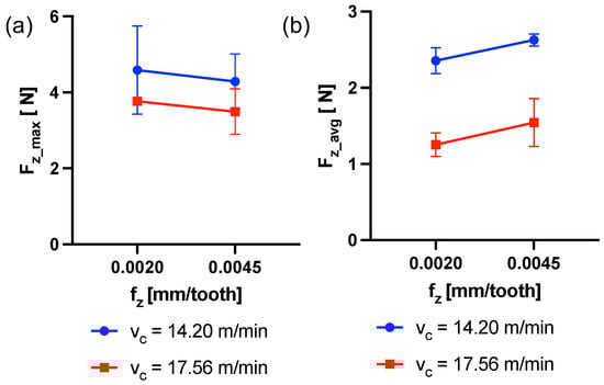 In Figure 14, the trend of the maximum value for each peck is shown grouped by experiment (Table 4). Regions of constant can be identified and associated with a stable cutting condition with good chip extraction from the cutting area. Other regions exhibit much higher variability, which could be associated with unstable conditions due to a critical chip evacuation. Among all experiments, exp2 ( = 0.0045 mm/tooth, = 17.56 m/min) showed the most stable cutting condition until the half of the drilling process (37–38 pecks), after which the thrust force increases (Figure 14b). In contrast, exp4 ( = 0.0045 mm/tooth, = 14.20 m/min) revealed a more unstable cutting condition throughout the entire process, suggesting that its combination of parameters is more prone to chip clogging (Figure 14d). The maximum force and the average force in the z direction were considered. The former is the absolute maximum value of thrust force (Figure 14a), the latter was measured as the average of the maxima of all pecks for each run. Statistical analysis was conducted by the TWA for . In this case, no statistically significant dependencies emerged from the cutting parameters or their interaction (p-Value > 0.05). The results are plotted in Figure 15a. The TWA test showed a statistically significant dependence of the response on both parameters but not on their interaction (p-Value () = 0.04, p-Value () < 0.001, p-Value () > 0.05). Figure 15b shows how the average thrust force increases with increasing feed per tooth and decreases with increasing cutting speed.