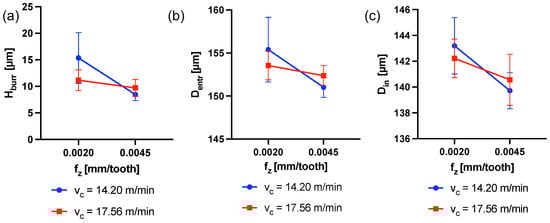 As for the diameters Dentr measured at the borehole entrance, the KW analysis revealed as the only affecting parameter (p-Value () < 0.001). In fact, an increase in the entrance diameter is observed when the feed per tooth is low. This is due to the increased time the tool spends inside the hole while rotating. Figure 16b shows the effect of cutting parameters on Dentr.