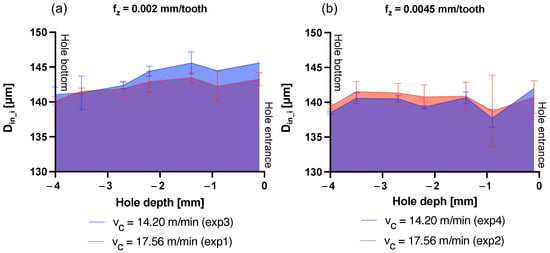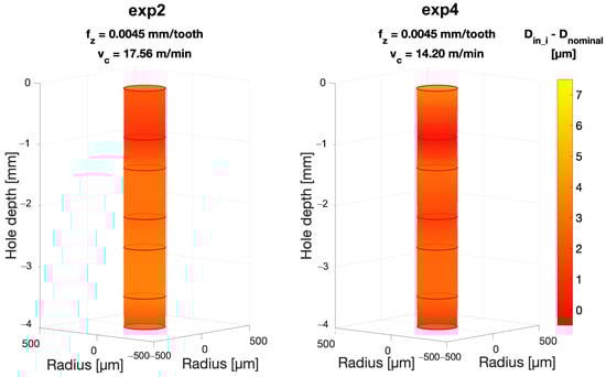 Inner hole diameter variation over the hole depth for exp2 and exp4 ( = 0.0045 mm/tooth) compared to the nominal . The color gradient is associated with the difference between the measured diameter Din_i (i = 1–7) and .
