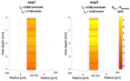 Inner hole diameter variation over the hole depth for exp1 and exp3 ( = 0.002 mm/tooth) compared to the nominal . The color gradient is associated with the difference between the measured diameter Din_i (i = 1–7) and .