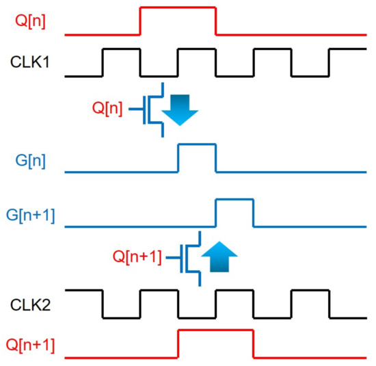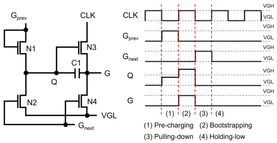 The basic structure of a TFT shift register at the backplane of N-type amorphous silicon (a-Si) TFTs [57,58] is depicted in Figure 2, where four TFTs (N1, N2, N3, N4) and one capacitor (C1) are employed with a low supply voltage level of VGL. The operation is explained by three phases of Pre-charging, Bootstrapping, and Pulling-down. In Pre-charging, a previous scanning pulse () pulls up Q through N1 turning N3 on, while N2 and N4 are turned off. Because CLK stays at the low voltage of VGL, the output (G) stays at the low level. In Bootstrapping, N1 is turned off by the low voltage of the output from a previous stage () while keeping N3 and N4 turned off. The rising transition of CLK to VGH increases the voltage of G, but there should exist a voltage difference of between gate and source nodes of N3. VGH is the highest voltage level used in the gate driver circuit, and is a threshold voltage of N3. The lowered output pulse is used to pre-charge a Q-node of the following shift register in which the output voltage level is further reduced, causing the pulse to vanish. To cope with this vanishing issue, C1 is placed between Q and G. Because Q is a floating node at the high-voltage level in the Bootstrapping phase, the voltage across C1 is retained by keeping N3 turned on. This is called a bootstrapping effect. Therefore, CLK is allowed to be transferred to G without any voltage degradation. In Pulling-down, the next scanning pulse of turns on N2 and N4, discharging both Q and G. After this, all TFTs are turned off, maintaining Q and G at low-voltage levels in Holding-low. The signal connections of basic shift registers for generating scanning pulses are described with two out-of-phase clocks (CLK1, CLK2) shown in Figure 3.