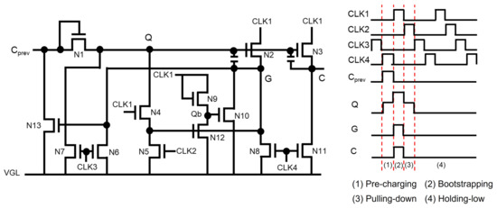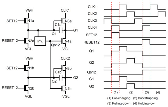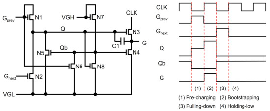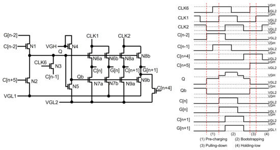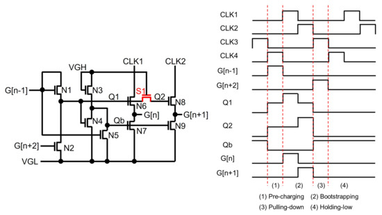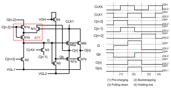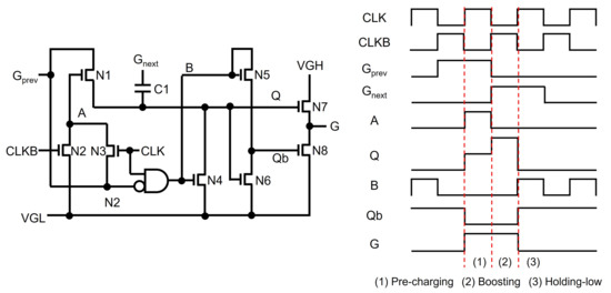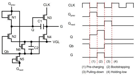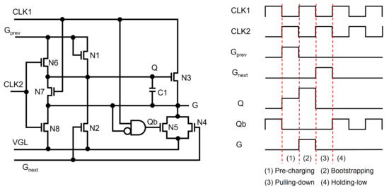 Most of the recent TFT shift registers keep pulling down Q and G nodes to the low supply voltage instead of maintaining low-voltage floating states. Jang et al. used another floating node to keep turning on switching TFTs of N2 and N4 connected from Q and G to VGL, as illustrated in Figure 4 [59]. Since a Qb-node is maintained at the high-voltage floating state during the whole Holding-low phase, Q and G can stably stay at the low-voltage level through N2 and N4. In addition, the Qb-node is away from CLK, unlike Q and G that are affected through N3; therefore, the fluctuation effect can be substantially reduced.