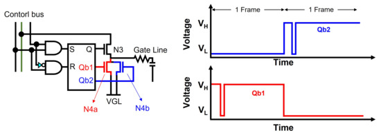 The frame-by-frame control of these pulling-down TFTs [69,70] has also been proposed to improve the reliability, as illustrated in Figure 9. Two different Qb1 and Qb2 nodes are applied to gate nodes of two pulling-down TFTs (N4a, N4b), respectively, while they are asserted in turns at every frame time. Therefore, N4a is turned on for odd frames and N4b is turned on for even frames, leading to a smaller shift.