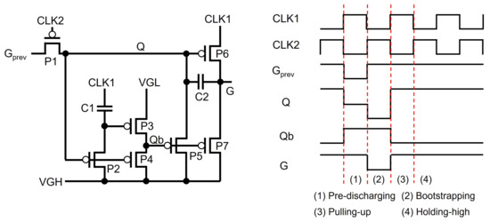 As presented in Figure 10 [78], in Pre-discharging, Q is discharged through P1 by the low pulses of and CLK2. This causes G to be high voltage with P6 by CLK1, pulling up Qb to turn off P5 and P7. In Bootstrapping, the Q-node at the floating low-voltage level goes down to the more negative voltage level by the capacitive coupling of C2 from G to Q with the falling transition of CLK1. Therefore, G can reach exactly the low level of CLK1 without any degradation. In Pulling-up, Q is charged through P1 by , turning off P2, P4, and P6. Thus, the internal inverter composed of P2, P3, P4, and C1 pulls down Qb to VGL, charging Q and G up to VGH through P5 and P7, respectively. In Holding-high, Qb stays at VGL to keep Q and G at the VGH level through P5 and P7.