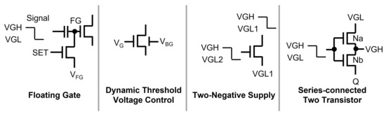 These days, oxide TFTs have become the mainstream of TFT backplane technologies due to their high mobility and low manufacturing cost; however, they have some challenges to take into account during the circuit design. One is the fact that N-type oxide TFTs are fabricated with negative ; that is, they are depletion-mode transistors where TFTs are turned on even at zero . Some methods have been reported to cope with this depletion-mode issue in TFT shift registers such as floating gate, dynamic threshold voltage control, two-negative-supply, and series-connected two-transistor (STT) schemes [80,81,82,83,84,85,86], as explained in Figure 11.