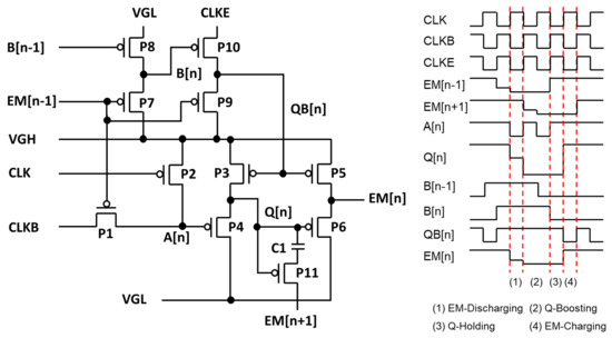 Thus, the operation of the EM pulse generation circuit should incorporate signal shifting and adjustable longer pulse width instead of scanning pulse width. An example EM pulse circuit is illustrated in Figure 17, where the output signal (EM[n]) is shifted in synchronization with clock signals (CLK, CLKB, CLKE), and its pulse width can be programmed via the pulse width of an input signal or a previous stage’s output (EM[n − 1]) [103]. The circuit is based on a P-type TFT backplane and composed of 11 TFTs and one capacitor, enabling the shift operation and the programmable pulse width. CLK, CLKB, and CLKE are clock signals of a 50% duty cycle, and VGH and VGL serve as the high and low power supplies, respectively. The timing diagram is divided into the four phases EM-Discharging, Q-Boosting, Q-Holding, and EM-Charging. During the EM-Discharging phase, low EM[n − 1] and the falling transition of CLKB cause A[n] and Q[n] to be pulled down to a low-voltage level with one line delay relative to EM[n − 1]. P6 is turned on due to low Q[n], resulting in low EM[n]. Meanwhile, P9 sets QB[n] to VGH by low EM[n − 1], turning off P3 and P5. During the Q-Booting phase, Q[n] is boosted below VGL in the negative direction by the falling transition of the next stage’s EM[n + 1] signal, ensuring the stable low voltage of VGL at EM[n]. In the Q-Holding phase, Q[n] and EM[n] are maintained at a low-voltage level. During the EM-Charging phase, the falling transition of CLKE sets QB[n] to the low voltage, pulling Q[n] and EM[n] up to VGH through P3 and P5, respectively. Consequently, variations on the width of EM[n − 1] result in corresponding changes in the width of EM[n].