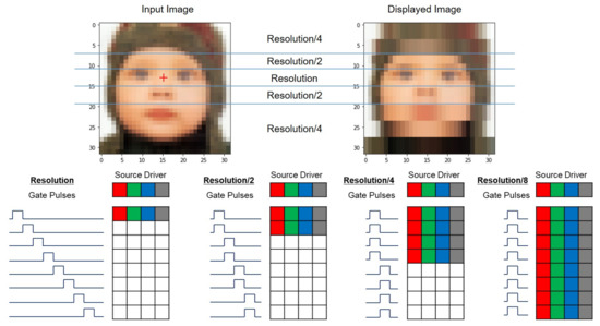 To address this issue, the foveation-based driving scheme has been proposed to reduce the effective number of lines in a frame by reducing the vertical image resolution of distant regions from the fixation point [108,109]. It is the high-resolution display driving technique that directly realizes the foveated-rendering images in a panel, as presented in Figure 18. The low-resolution areas are driven by multi-line driving shift registers to be able to provide synchronized pulses to multiple lines at the same time. For 1/2, 1/4, and 1/8 resolution areas, 2, 4, and 8 lines are driven at the same time, respectively, resulting in the reduction in the effective number of lines by the same factors. The multi-line driving shift registers are implemented based on the Q-node sharing architecture described in Section 2.6 [90,91], and the output pulse sequences are adjusted by changing the timing of the clock signals [110]. Effective numbers of lines are reduced to 30.3% and 21.0% for 4800 × 4800 and 9600 × 9600 resolutions, respectively. Consequently, the charging time of a line can be extended to 330.0% and 476.2% for those resolutions.