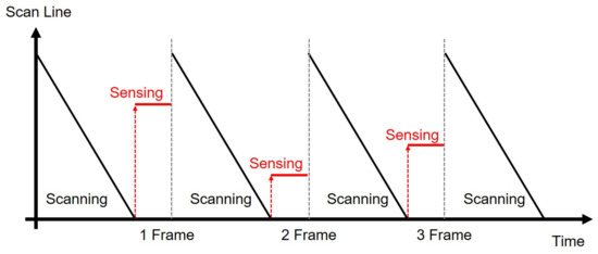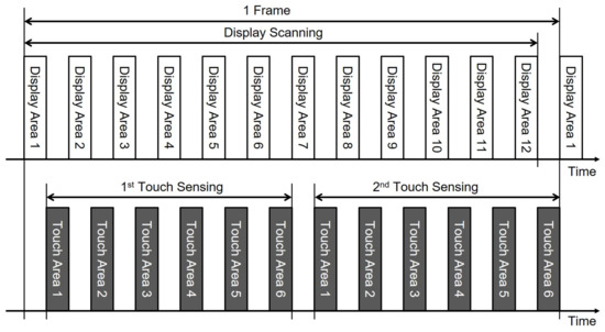 Because the capacitive touch screens use capacitive coupling effects to detect touches, the in-cell touch circuit’s performance is also sensitive to the coupling noises from the display circuits such as gate drivers and source drivers. To avoid the degradation of the detection performance by display noises, the touch sensing operation was conducted only during the vertical blank [111], in that no scanning functions worked. Touch sensing only in the vertical blank showed the un-natural representations of moving touch actions, and there was a difficulty in achieving a touch reporting rate higher than the display frame rate. Therefore, the touch sensing intervals have been inserted in the middle of the display scanning operation, as depicted in Figure 19 [112,113,114,115,116]. It is called a time division driving method (TDDM).